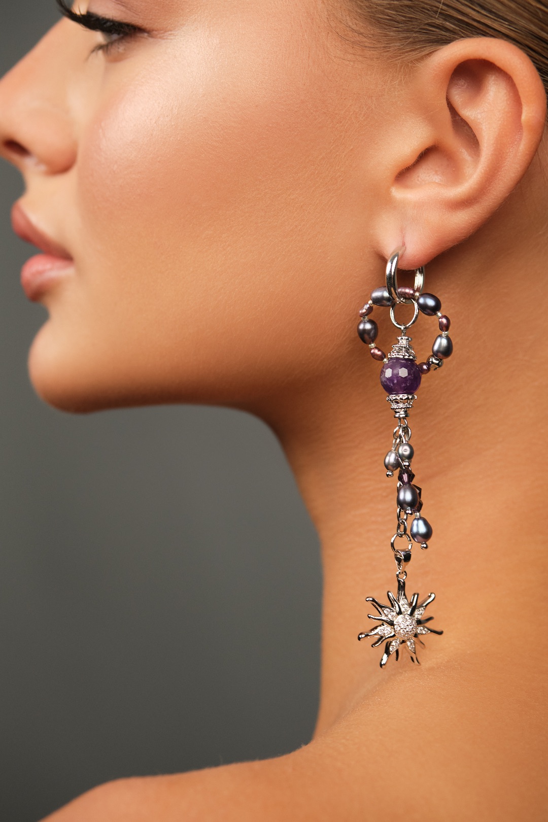 Серьги–трансформеры VIOLETTA Аметист натуральный, жемчуг чёрный и серый натуральный, подвеска с перламутром, швензы - серебро 925. 4.800₽Связаться с нами